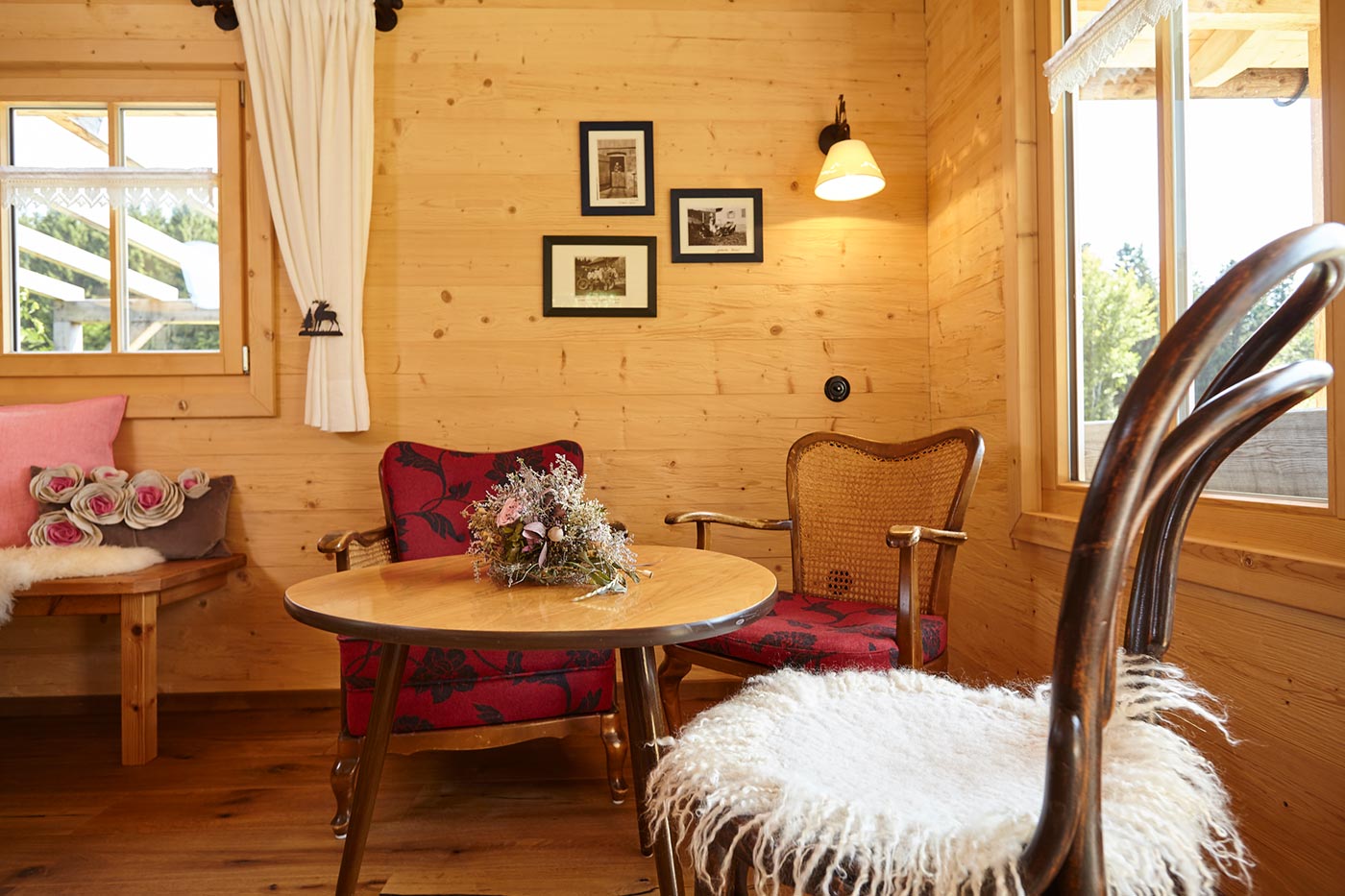 Umrahmt von einem liebevoll angelegten Alpenbeet, einem Naschgarten für die Kinder sowie einer mit Robininenholz eingefassten Sandkiste wurde das Haus in Blockständerbauweise komplett aus Holz errichtet. Die Inneneinrichtung wurde von unserem Schreiner aus Altholz gefertigt. Die mit einem Innovationspreis ausgezeichneten "Trix"-Stühle -eine Neuinterpretation des klassischen alpinen Brettstuhls- stammen von einer Möbelmanufaktur aus dem benachbarten Bregenzerwald in Österreich.